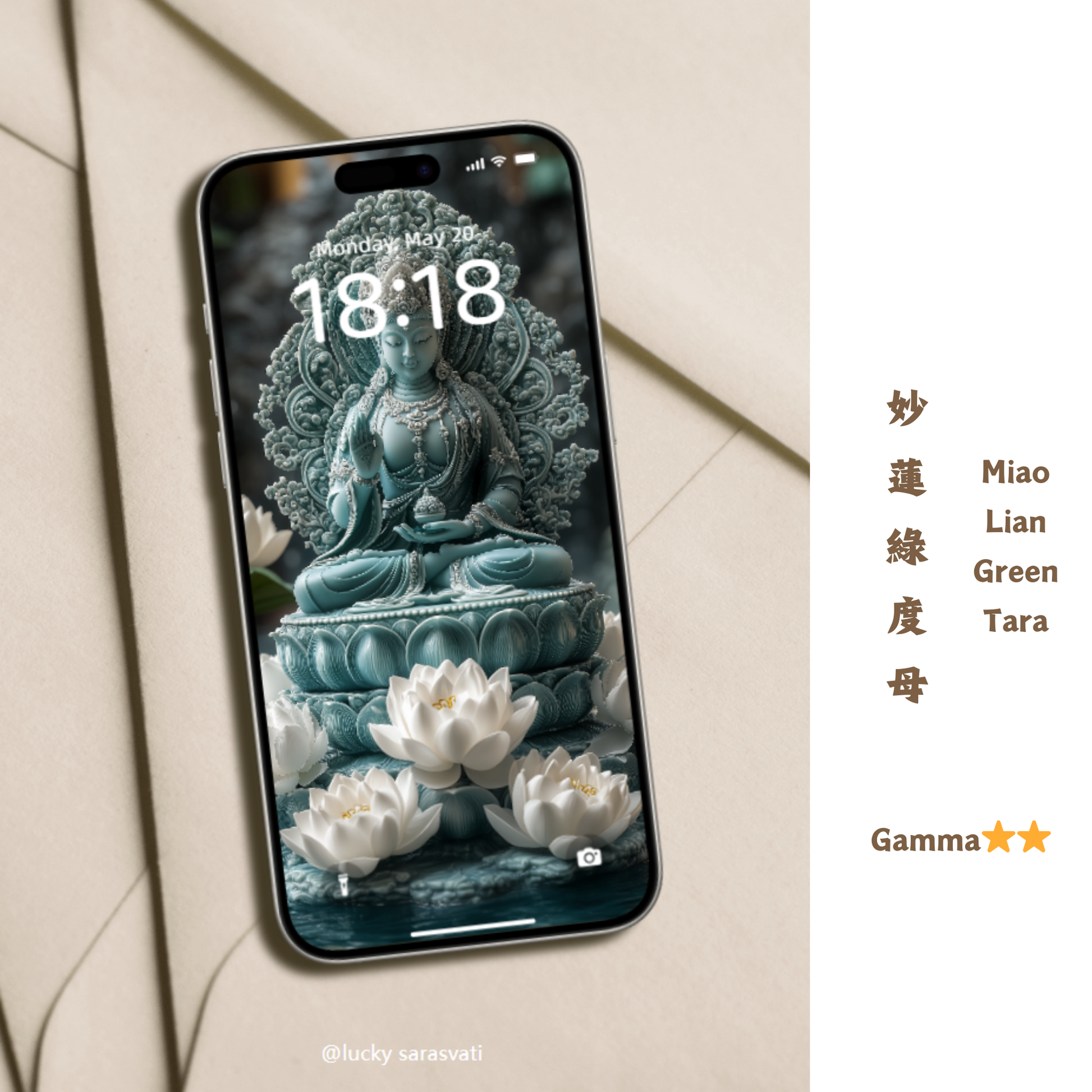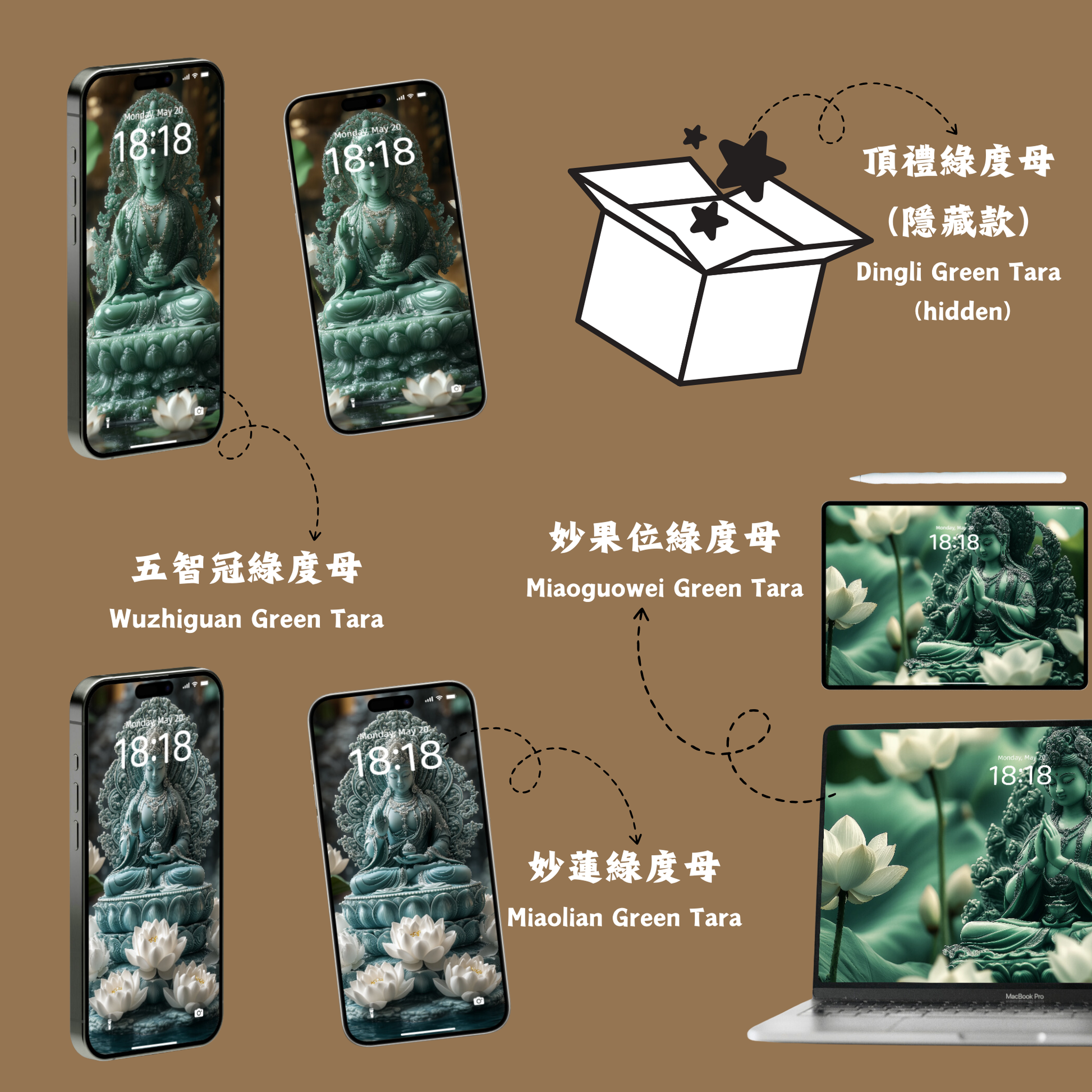 款式:4款不同能量壁紙,分別為五智冠綠度母(豎版能量壁紙)、妙蓮綠度母(豎版能量壁紙)、頂禮綠度母(豎版能量壁紙,且為隱藏款)、妙果位綠度母(橫版能量壁紙)