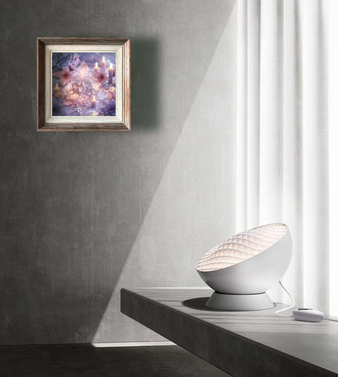 作品意境: 本作品意境來源於宋代詞人晏幾道的名句:“衣帶漸寬終不悔,為伊消得人憔悴。”心愛之人願意為了你付出一切,象徵著情感的深厚與執著。透明和淡淡的粉色象徵著純潔與溫柔,就像是初戀時那份柔軟的心情,輕輕地觸碰就能引起漣漪。金字塔的底部放置著的能量石,半透明的金字塔中盛開著青春之花,宛如愛情中那些美好的瞬間,讓人回味無窮。