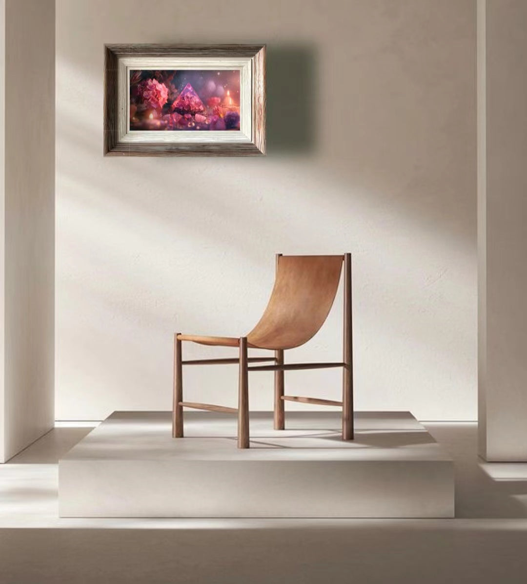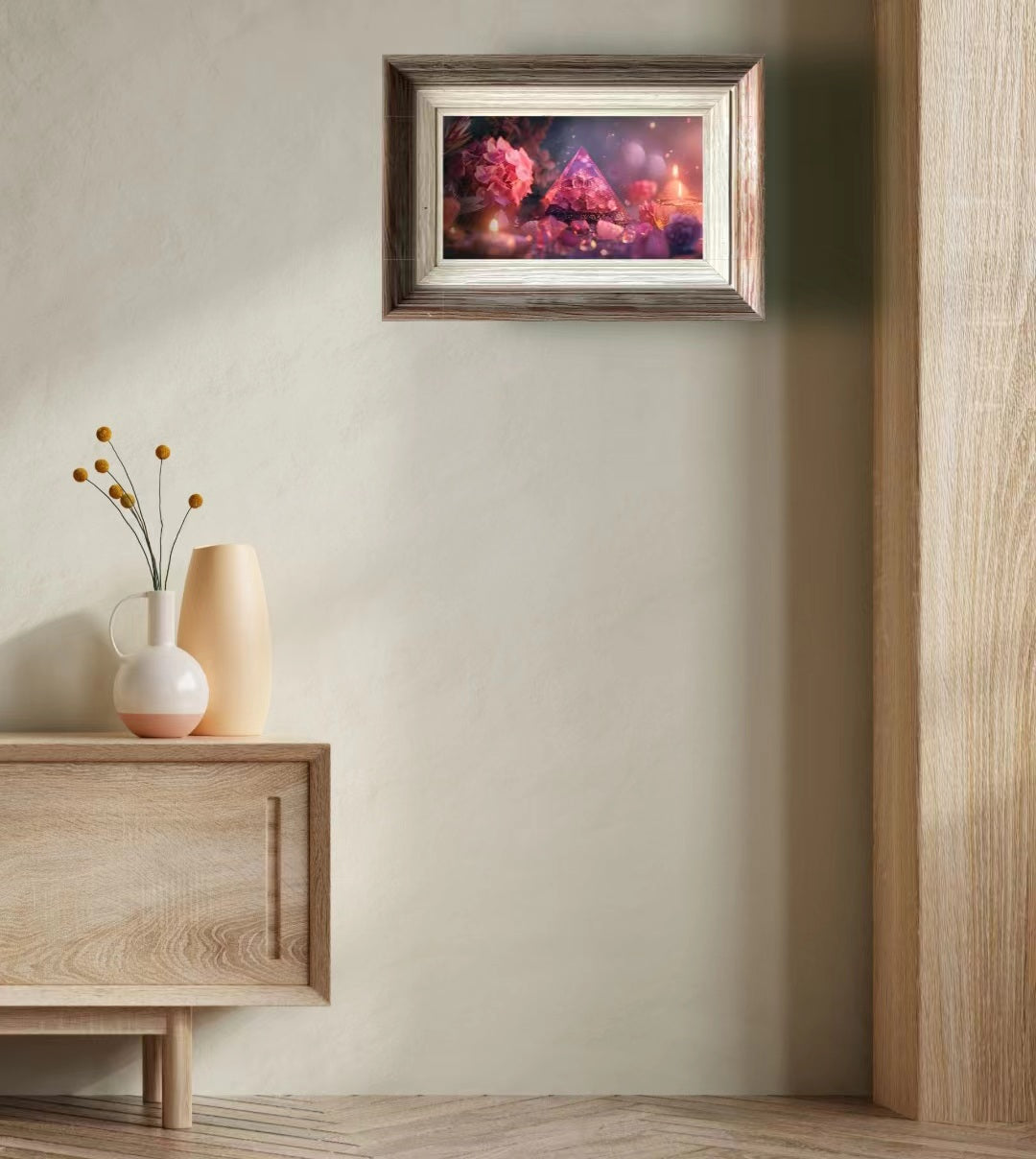 Artistic conception of the work: The artistic conception of this work is inspired by the "mountain without mausoleum, heaven and earth together, but dare to be with the king." This painting depicts the kind of love that transcends time and space, strong and beautiful, like these hydrangeas, even in the softest tones, but also hidden the deep strength and tenacity of love. The soft transparency of pink in the work is not only a choice of color, it is like people's longing for the memory of first love, the gentle emotion that is generated by light touch, which makes people feel overwhelmed. The energy stone at the bottom of the pyramid condenses the imprint of time, giving the picture a yearning for eternal power. This translucent structure is like a heaven and earth of love, with hydrangeas in full bloom, with their beautiful form to capture our pursuit and yearning for love. This work is a celebration of the most precious nature of love - no matter how the passage of time, true love is always so exciting