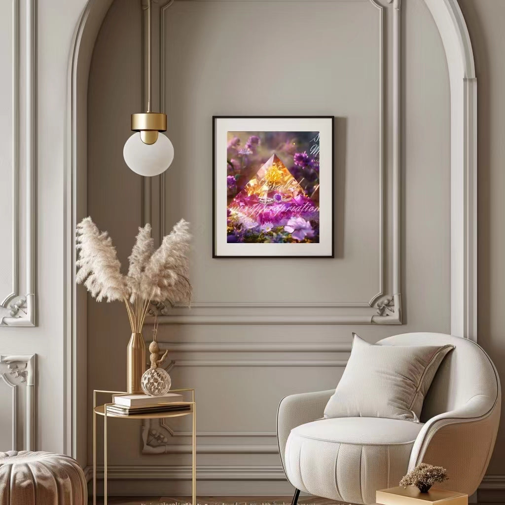 作品意境: 本作品靈感來自於電影臺詞,“愛是一場旅程,而我們一起走過。”這幅作品展現了美好戀愛與婚姻的意境,金字塔內鑲嵌的戒指象徵著愛情的承諾與永恆,周圍綻放的花朵和溫暖的光芒營造出浪漫與幸福的氛圍,完美詮釋了愛情和婚姻中相互扶持、共同經歷的美好。作品中的每一處細節都象徵著愛與承諾的美好,讓人感受到婚姻中那種溫暖與滿足,仿佛一切美好都在這金字塔下永久地閃耀著,提醒我們珍惜眼前人,享受每一刻的幸福時光