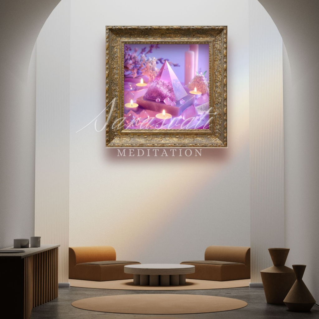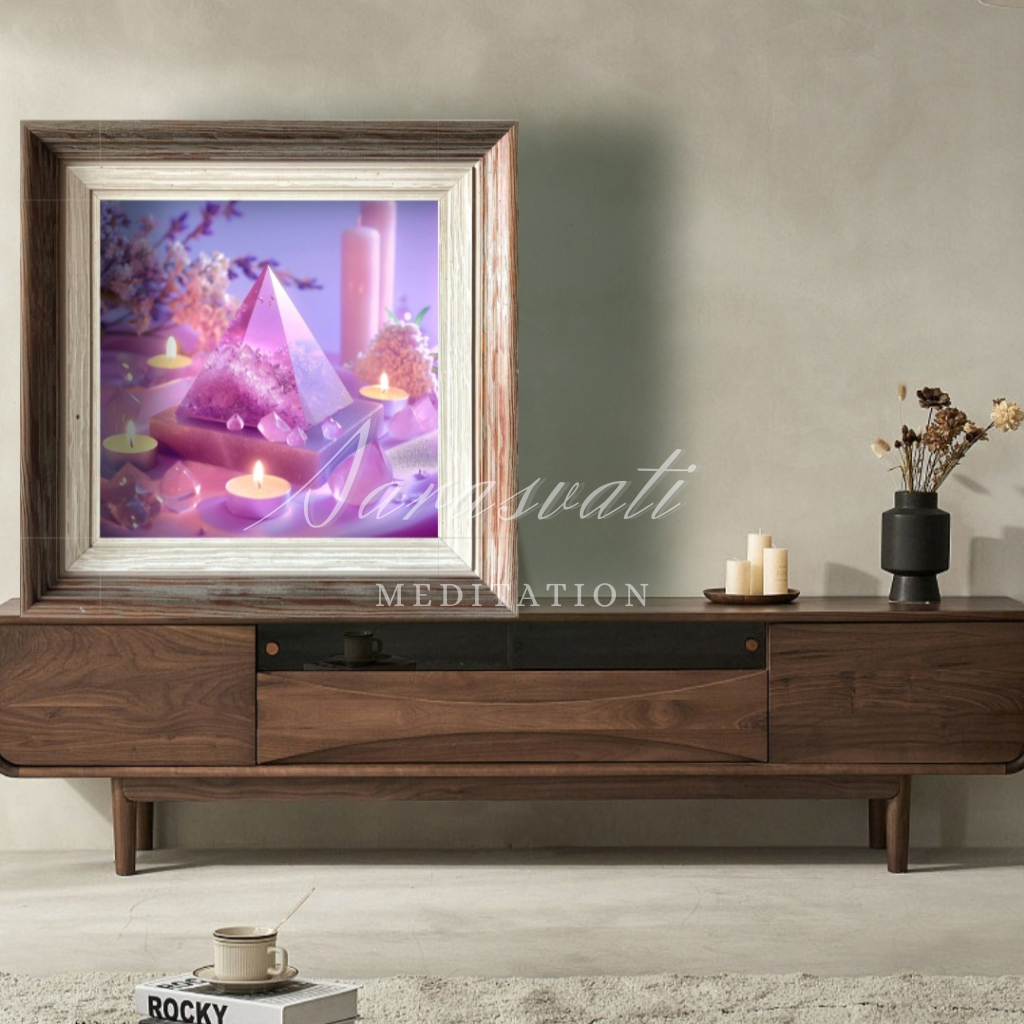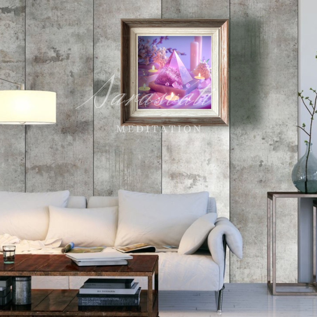 Artistic conception of the work: This work uses frosted transparent material to design the pyramid, the whole pink purple as the background tone, meaning that the relationship is renewed. The pyramid is placed on top of a natural energy stone base to further consolidate the energy of the pyramid, and transparent powder crystals placed around it can help purify the magnetic field.