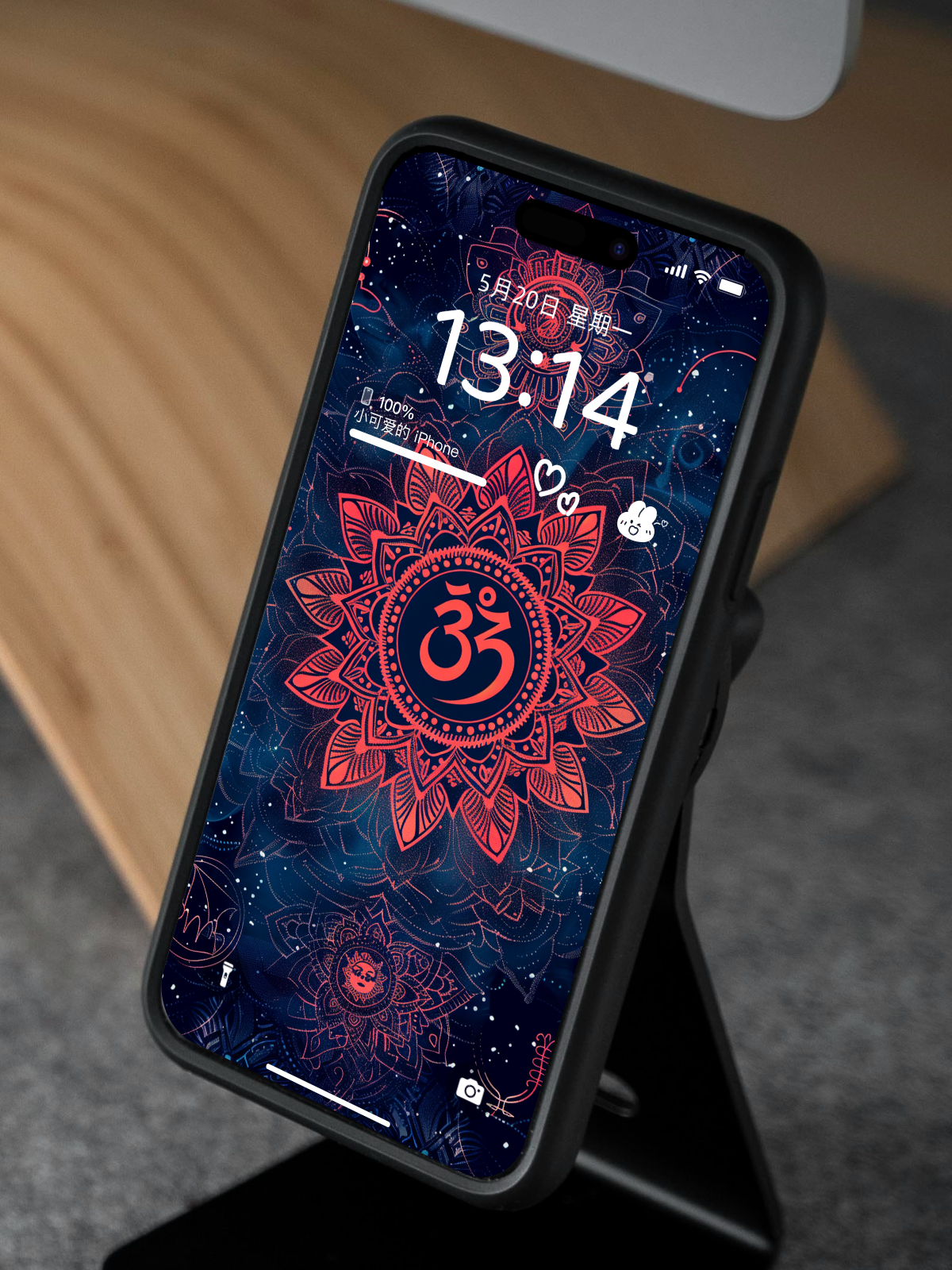 壁紙中心圖案介紹: 「ॐ」念Om,是一個發音(梵文「ॐ」),最早出現於印度教經典《吠陀經》中。古代的印度認為”Om”是宇宙萬物的起源,是宇宙第一個震動的聲音,它代表創造開始的源頭,萬物的基礎。Om有助幫助大腦放鬆、重設大腦注意力、減除雜念、舒緩情緒、令自己開始進入比較平靜的狀態、促使身心平衡、喚醒自身內在的力量從而產生能量、引領我們進入更高的靈魂層次並與宇宙連接。(*在科學的角度,科學家亦發現唱頌Mantra (*包括Om在內*)有令呼吸放慢、心跳平穩且緩和的作用。因此唱頌被認為對身心靈都很有益處。)