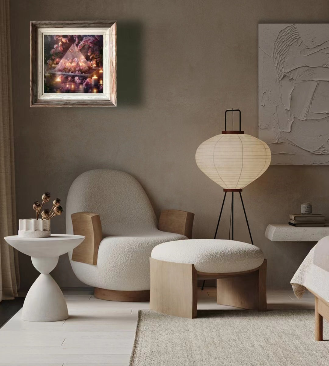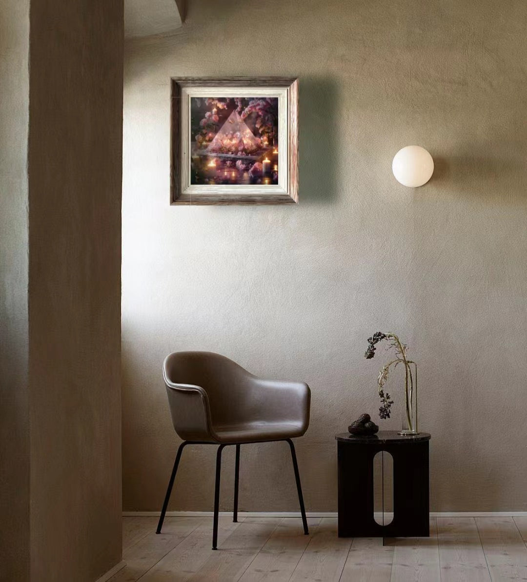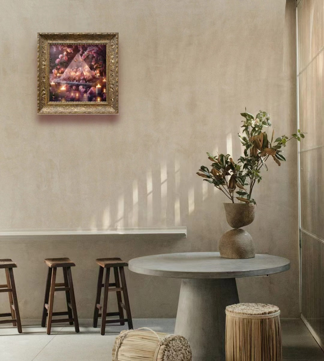 Artistic conception of the work: This work is inspired by the Tang Dynasty poet Zhang Hu's love motto: "Lovers complain about distant night, but they are lovesickness." In the long night, the thoughts in each heart are like delicate light, penetrating the barrier of distance. The pink orange color of the pyramid reflects the warmth of the heart, and the gilt decoration symbolizes the sublimation of the soul every time. The deep grey rock base at the bottom of the pyramid is like a solid foundation of love, which will stay firm regardless of the wind and rain. The surrounding votive flowers are a vivid reflection of the beautiful vision of love, while the votive candles flashing behind them, like starlight, carry the wishes of the couple for the future. It is a world of love, hope and promise