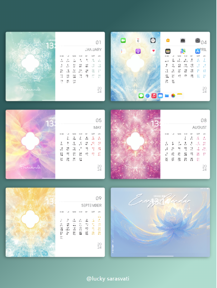 關於能量日曆: 本款為2024年日曆,左側搭配的能量圖案為我們在售的能量壁紙,右側為日期,日期下方同步有標注農曆、二十四節氣、東方傳統節日、西方傳統節日、國際節日。日曆的左側配圖是截取了我們在售能量壁紙的部分圖案,在左側能量圖案中心,我們也額外設計了代表幸福和幸運的四葉草,四葉草採用留白設計,與右側日期底色相呼應,整體能量等級為Zeta⭐️。左側能量壁紙的完整無水印無四葉草留白版可以在我們店鋪中找到在售链接哦,完整的能量壁紙的等級均在Gamma⭐️⭐️及以上。